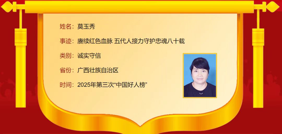 今年是中国人民抗日战争暨世界反法西斯战争胜利80周年。莫玉秀一家四代人用80年的默默坚守,谱写了一曲感人至深的“诚实守信”赞歌,让“一诺千金”的中华传统美德在当代社会绽放出璀璨光芒。今年,莫玉秀成为“中国好人榜”诚实守信好人。
