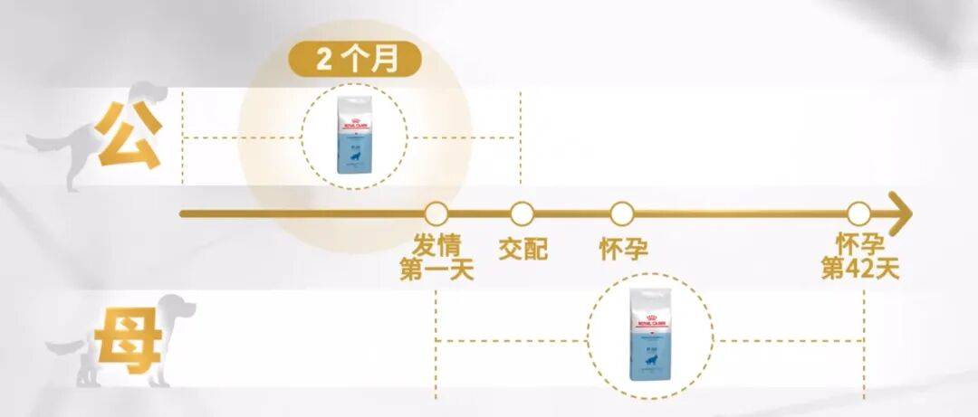 另外,产品名称还揭示了对应的分阶周期,一方面适用于种公的精准营养,同时适用于母犬发情至孕期前 42 天,充分体现了皇家对生命周期中这关键 42 天的潜心专研。